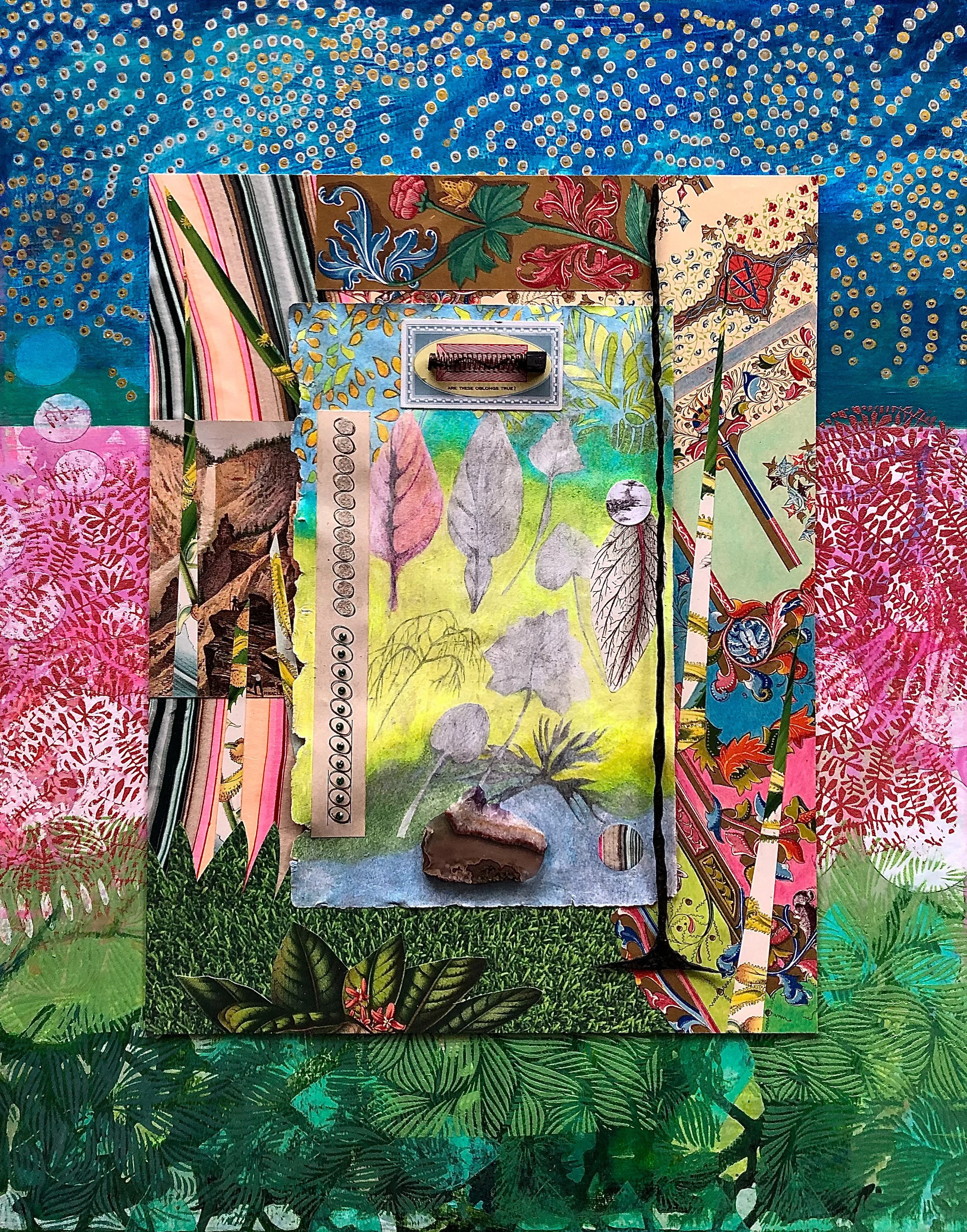 Seaweed, 2019, acrylic, spray paint, pencil, crystals, tintype, thrifted objects, paper, on mat board, 14 x 11 in. Private Collection