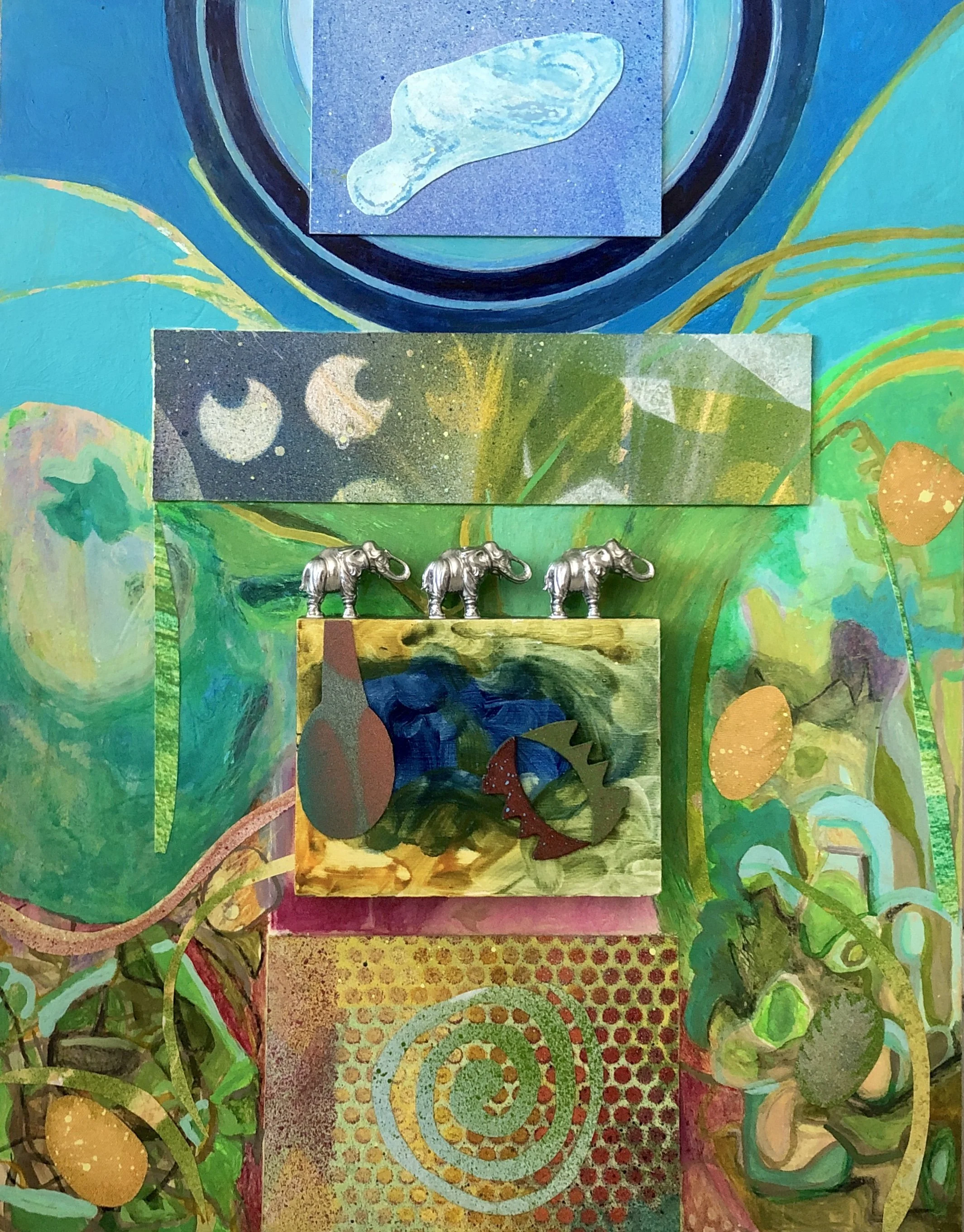 Elephants, 2023, acrylic, spray paint, color pencil, wood, steel, plastic, papers on mat board, 14 x 11 in. Collection University of Iowa Hospitals and Clinics